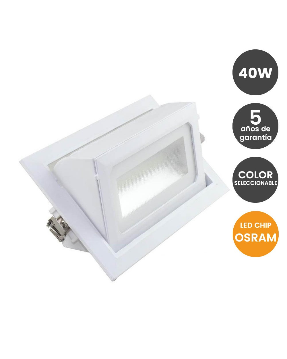 12 UNIDADES POR CAJA MASTERFoco proyector LED empotrable y orientable fabricado en aluminio con 40w de potencia. Color seleccionable y protección IP20.