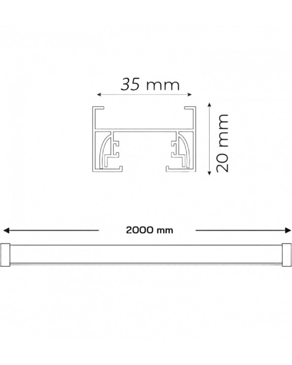 Carril Monofásico 2 metros Reforzado para focos LED. Fabricado en aluminio, con conexión en un extremo y protección IP20-Interior.